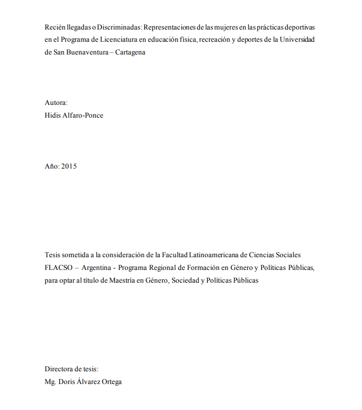 Este documento recoge la investigación realizada sobre Representaciones de las mujeres en las prácticas deportivas en el Programa de Licenciatura en educación física, recreación y deportes de la Universidad de San Buenaventura – Cartagena, realizada en el periodo 2013-2014, cuyo objetivo general fue Indagar las representaciones existentes alrededor de las prácticas deportivas de las mujeres estudiantes de Licenciatura en Educación Física, recreación y deportes de la Universidad San Buenaventura. El proceso de investigación conllevó procesos de documentación teórica y la realización de un trabajo de campo con docentes, estudiantes y directivo del Programa en mención. El estudio se elaboró en armonía con el paradigma cualitativo, el estudio se centró en una situación particular, no tiene ninguna pretensión de generalizar los hallazgos o los resultados encontrados, se inscribe en la tradición de la investigación fenomenológica. Entre los resultados encontrados sobresalen: Una visión tradicional hegemónica de feminidad y masculinidad, encarnadas en representaciones tradicionales de masculinidad y feminidad, así como en ideologías subyacentes y en los estereotipos que se desprenden de su realización y frente a una visión menos tradicional de la feminidad y la masculinidad transitando en unas vivencias más transgresoras. Los representaciones e ideologías tradicionales de género aun persisten en las vivencias estudiantiles dentro del Programa, manifiesto, principalmente, en los señalamientos que se hacen a las estudiantes por estudiar una carrera predominantemente masculina en este medio; en los relatos sobre masculinidad siguen apareciendo las narraciones de la misma como sinónimo de fuerza y arrojo frente a una feminidad delicada, débil y sensible; la feminidad en las mujeres es vista como sinónimo de sutileza, delicadeza y fragilidad, cualidades que no corresponden a prácticas deportivas como el baloncesto, atletismo y futbol, deportes que hacen parte de la malla curricular del Programa.