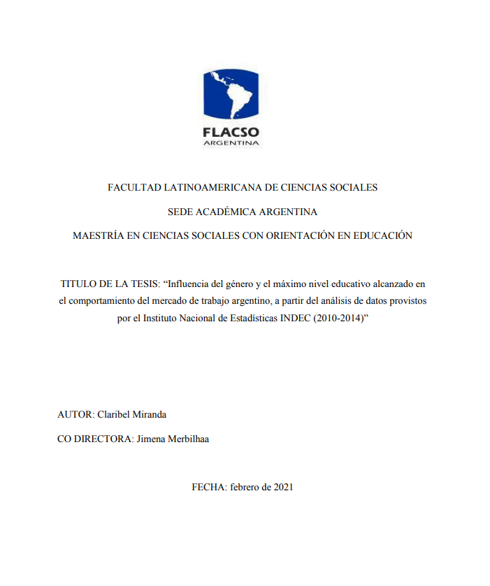 En la Argentina actual, la manera en la que la población participa y se desarrolla en el mercado de trabajo es profundamente desigual. Las desigualdades existentes están influidas por una serie de variables económicas, sociales y personales, entre las cuales se encuentran el máximo nivel educativo alcanzado y el género. La presente investigación evidencia como estas dos variables influenciaron y condicionaron el comportamiento del mercado de trabajo argentino de la población de entre 15 y 59 años durante el periodo 2010-2014 y qué fenómenos sociales producen y reproducen las desigualdades encontradas. El objetivo de evidenciar esta realidad, es contribuir teóricamente a la creación y el fortalecimiento de políticas públicas que le permitan a toda la población, tener las mismas oportunidades de participar y desarrollarse en el mundo del trabajo, construyendo así, una economía más productiva y una sociedad más justa.