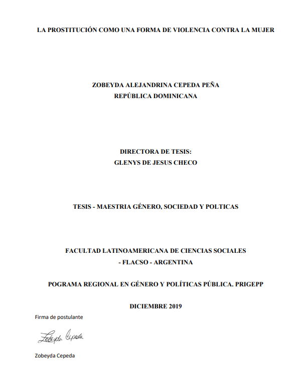 La reglamentación del trabajo sexual constituye uno de los mayores debates globales en torno a la afectación de las medidas neoliberales para alcanzar la igualdad de género. La República Dominicana entró hasta cierto punto en esta discusión a través de la presentación de dos proyectos de leyes debatidos públicamente entre los años 2013 y 2014, ambos perimidos actualmente en la Cámara de Diputados/as. Hasta el momento los actores que impulsan la legislación no han reintroducido las piezas ni forman parte de la agenda pública. En círculos feministas el tema ha venido tomando relieve sin ser parte de la agenda principal y formal de estos movimientos. Las organizaciones de trabajadoras sexuales se asumen como tal, sin ocupar la agenda pública, como ya se ha expresado.Esta tesis tiene como objetivos comprender y profundizar la experiencia de la prostitución como mercado laboral desde los relatos de mujeres que ejercen la prostitución en las ciudades de Santo Domingo y Santiago de la República Dominicana; y analizar las implicaciones entorno a la adopción de un marco legal regulatorio como parte de la política pública estatal.