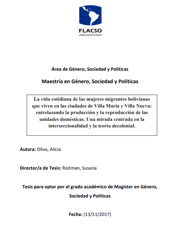 Este trabajo es el resultado de un proceso de investigación que analiza las trayectorias y la vida cotidiana de las mujeres migrantes bolivianas afincadas en las ciudades de Villa María y Villa Nueva (Córdoba/Argentina) desde la perspectiva de género decolonial y el análisis interseccional.