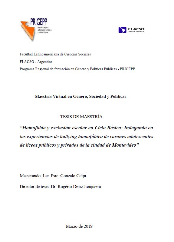 Homofobia y exclusión escolar en ciclo básico : indagando en las experiencias de bullying homofóbico de varones adolescentes de liceos públicos y privados de la ciudad de Montevideo