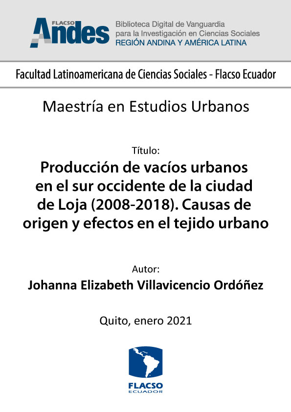La presente tesis aborda las causas que producen los vacíos urbanos a través de cuatro supuestos relacionados a la variación del precio del suelo, tipo de tenencia, cambios en los usos de suelo y normativa municipal. Considerando el marcado crecimiento espacial se realizó en recorte espacial del sur occidente de la ciudad de Loja – Ecuador en el periodo 2008 a 2018. Se propuso una metodología de cuatro etapas para identificar los vacíos urbanos en el área de estudio utilizando técnicas de análisis espacial con Sistemas de Información Geográfica y fotointerpretación, mediante un inventario se establecieron los vacíos urbanos para posteriormente realizar una aproximación espacial excluyendo los vacíos menores o iguales a 500m2, se propuso una aproximación visual utilizando ortofotos y determinando la permanencia de los mismos obteniendo un segundo recorte espacial para definir en la última etapa las 60 unidades de análisis que corresponden a esta investigación.