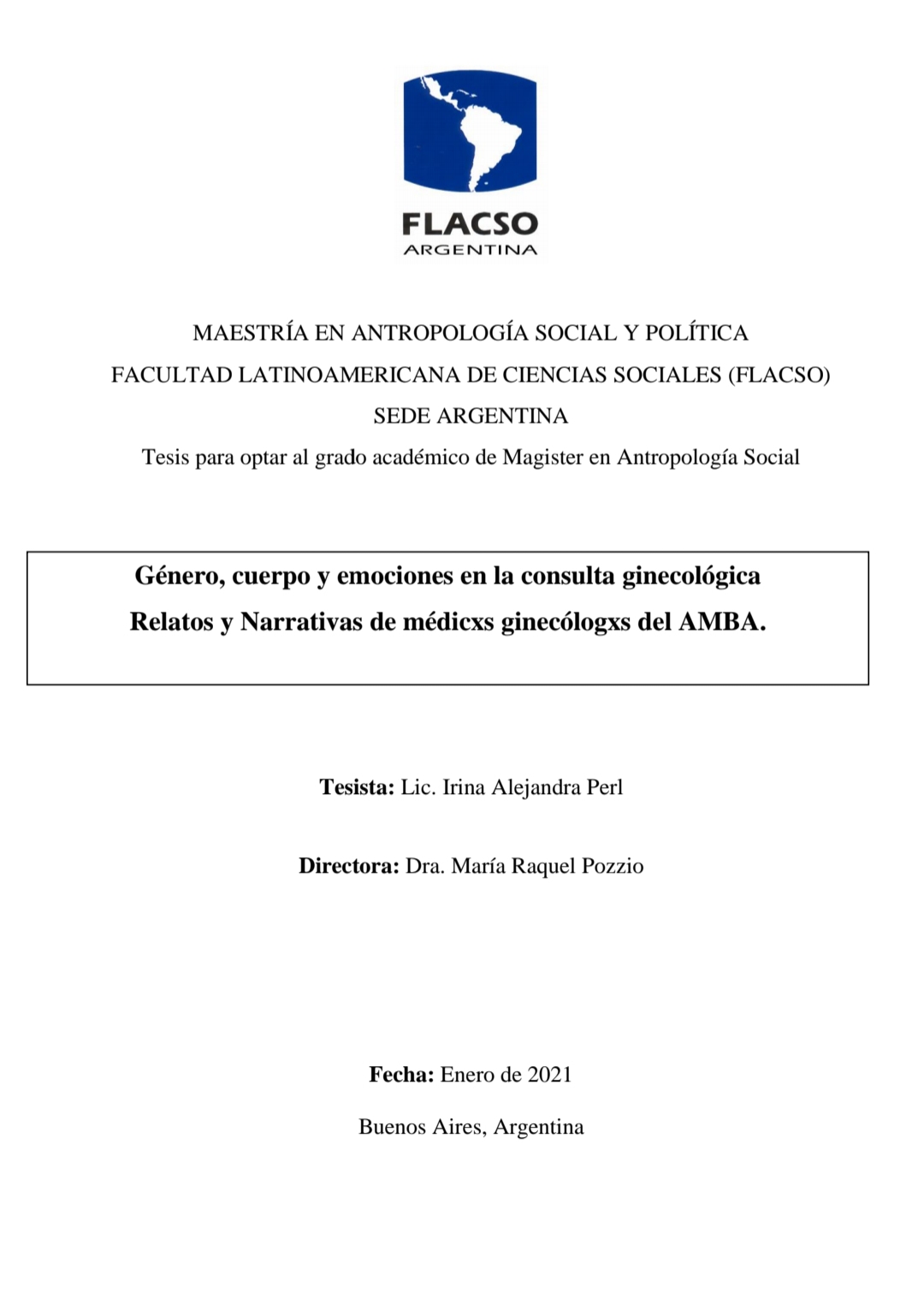 El objetivo de esta tesis es conocer y describir el punto de vista de medicxs ginecologxs acerca de distintas aspectos que hacen a la consulta ginecológica y que son más amplias que la detección y/o tratamiento de enfermedades como el cáncer cervicouterino. Me propongo, a partir de sus narrativas dar cuenta de cómo significan lxs profesionales, la consulta ginecológica a través de las explicaciones nativas sobre fenómenos como la violencia obstétrica, la relación del género de lxs profesionales con la especialidad y las emociones en el marco de la consulta ginecológica. Considero que estos aspectos de la consulta están íntimamente relacionados con los estereotipos, roles y expectativas que el sistema sexo-género define para cada género. También están atravesados por las relaciones de poder asimétricas que se dan en el marco de las relaciones entre profesionales de la salud y usuarias y entre las profesionales mujeres y los profesionales varones, así como por la pretensión de asepsia sociocultural y emocional de la práctica médica y su mirada tecnocrática.