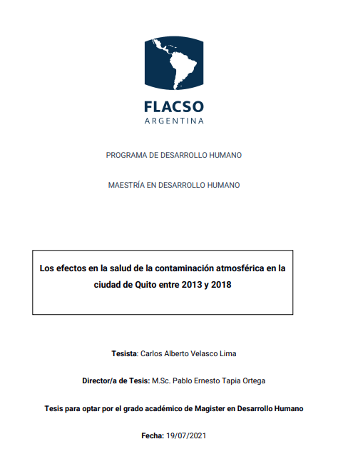La presente tesis tiene como principal objetivo analizar los efectos en la salud ocasionados por la contaminación atmosférica en Quito, considerando el periodo 2013 – 2018.