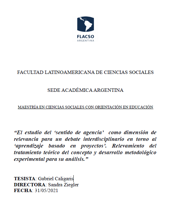 y sensación de agencia (entre hacer y sentirse en control de la acción) es fundamental para los debates pedagógicos en general, y en particular para la muy contemporánea discusión en torno a la propuesta del aprendizaje basado en proyectos (ABP), que busca poner a las estudiantes en un rol central, activo y protagónico. La descripción del problema en principio da cuenta de un vacío teórico en el tratamiento de estos conceptos (tanto “agencia” como “sentido de agencia”) en los debates educativos actuales, lo cual se enmarca en una falta de diálogo más generalizada entre los campos de las ciencias de la educación y las ciencias cognitivas. La separación esencial entre la agencia y su experiencia subjetiva simplemente queda fuera de la discusión, y con ella todo lo que puede aportar al momento de proponer y analizar proyectos de transformación pedagógica. Luego de las preguntas que orientan la investigación (“¿cuál es el tratamiento teórico de estos conceptos en los debates en torno al ABP?”, “¿qué puede aportar la teoría cognitiva sobre el SdA a la conversación?”, “¿pueden medirse los niveles de SdA en estudiantes de una escuela secundaria? ¿cómo?”), el desarrollo primero describe las nociones centrales de “agencia” (desde autoras como Giddens, Davidson y Ahearn) y de “sentido de agencia” (desde autores como Gallagher, Dennett, Wegner, Damasio y Haggard). A esto le sigue un recorrido por los debates actuales sobre el ABP (a