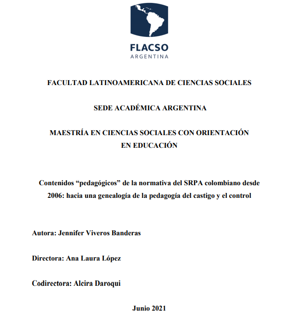 La presente tesis de maestría se basa en una investigación exploratoria-descriptiva a través un estudio documental sobre los contenidos “pedagógicos” del Sistema de Responsabilidad Penal Adolescente [SRPA] colombiano, que se sustentan en el Código de la Infancia y la Adolescencia (Ley Nº 1098 de 2006) y los Lineamientos del modelo de atención para el SRPA, a partir del cual se observa y analiza la relación de dichos contenidos en los dispositivos de castigo. El estudio aporta un análisis descriptivo de los contenidos “pedagógicos” de los documentos seleccionados, así como el relevamiento de datos estadísticos del SRPA, en especial, de las modalidades de encierro punitivo; a partir de esta información se realiza un mapeo nacional del sistema penal adolescente y se analiza en relación con la fundamentación pedagógica que presentan los Lineamientos.