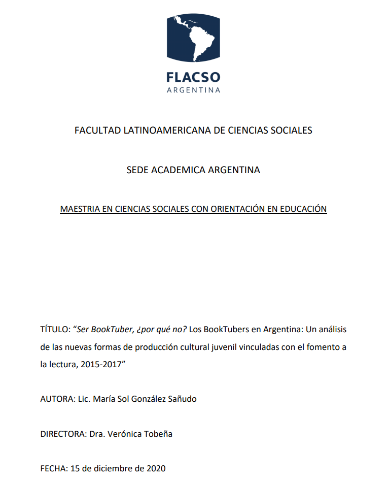 La llegada a los medios de comunicación de los BookTubers en 2015 a partir del primer encuentro organizado por la Feria Internacional del Libro de Buenos Aires visibilizó su existencia como fenómeno adolescente y juvenil. Esta tesis indaga en su universo entre 2015 y 2017 guiados por la pregunta de si los canales de YouTube que administran los jóvenes de argentina funcionan como mediadores de su “salida” al mundo. Es un trabajo de exploración que permite dilucidar prácticas juveniles que conforman secuencias de vivencias nacidas en el mundo digital que se expanden al mundo físico. A lo largo de la investigación se estudia la construcción como lectores y promotores de la lectura entre pares, se reconstruyen los sentidos que tiene para los jóvenes BookTubers argentinos tener un canal que transmita su “pasión por los libros”; la conformación del yo público a partir de la exposición de su persona en sus propios videos; los espacios de encuentro de los BookTubers que enriquecen la construcción de comunidad; y los entrenamientos, habilidades y/o herramientas que redundan de la experiencia BookTubers dando cuenta de sus maneras de conocer. La investigación se propone ser un aporte a la comprensión de las “formas de vida tecnológicas” (Lash, 2005) desde la perspectiva de sus protagonistas, ya que hay sus modos de habitar el mundo marcan discontinuidades con quienes crecimos al calor de la era Gutenberg.