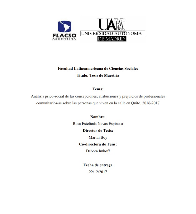 La realidad de las personas que viven en la calle en Ecuador es preocupante, lo cual indica la pertinencia de abocarse al estudio de este fenómeno. Al respecto, se ha identificado que lo que prima en la producción académica en el país son investigaciones en torno a diversos aspectos de estas poblaciones, siendo escasa la indagación sobre las concepciones y prejuicios de los/as profesionales que trabajan con las personas que viven en las calles. Por ello, se realizó una investigación empírica cualitativa, con alcance descriptivo, con el objetivo de profundizar desde la perspectiva de la Psicología Socio-cognitiva en las perspectivas de los/as profesionales comunitarios/as abocados al trabajo cotidiano con estas poblaciones. Así, el objetivo general del estudio fue el de describir, a partir de un abordaje psico-social, las concepciones, atribuciones y prejuicios sobre las personas que viven en la calle que poseen los/as profesionales comunitarios/as que trabajan en ese ámbito y como estas repercuten en el diseño e implementación de intervenciones profesionales en Quito, Ecuador. Se realizaron entrevistas semiestructuradas a 14 profesionales de distintas instituciones inmiscuidas en proyectos de inclusión social orientados a personas que viven en la calle en el Ecuador, las cuales fueron analizadas a partir de un análisis de contenido cualitativo temático. Los resultados muestran las variadas formas que los/as profesionales manifiestan al momento de caracterizar a este grupo social, así como las explicaciones y atribuciones causales que otorgan al momento de dar cuenta de cómo llegan a vivir en la calle estás poblaciones. También fue posible identificar las valoraciones emitidas y los prejuicios que los/as profesionales poseen con respecto a las personas que viven en la calle. Finalmente, se relevaron las concepciones de los/as profesionales en torno al impacto de sus concepciones sobre sus propias intervenciones con estas poblaciones. En función de los hallazgos, se presentan una serie de discusiones y reflexiones finales que pueden orientar futuras intervenciones con estos grupos de profesionales.