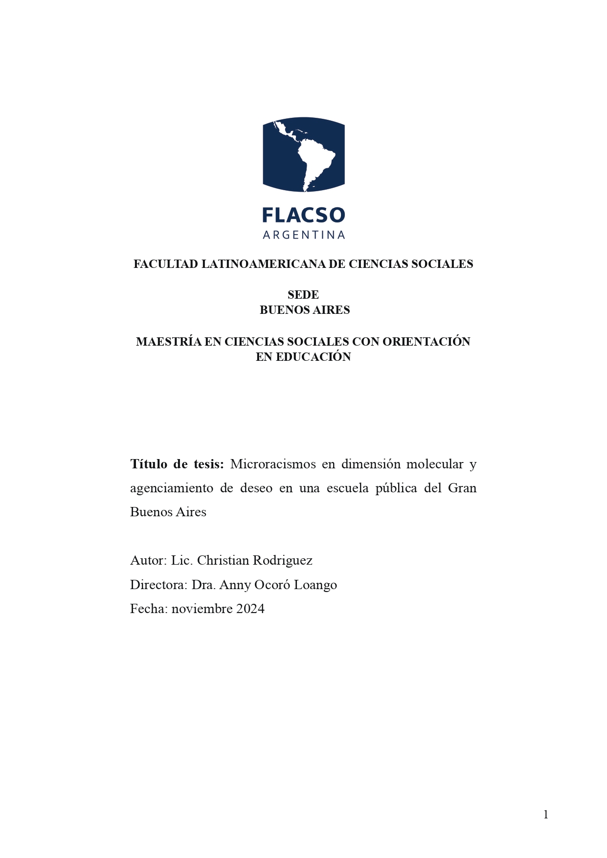 This research explores the relationship between microracisms and desire in a public school in the Buenos Aires metropolitan area. The subjects of the research are students in the last year of primary school and the theoretical perspective with which this work is approached is the understanding of desire in Félix Guattari. The dimensions through which desire is addressed in school in the context of microracisms are art, games, semiotics and relational. The central question of this research is related to the type of agency of desire that appears among students in the last year of primary school in contexts of microracist violence in public school number 65 of Don Orione, Claypole.