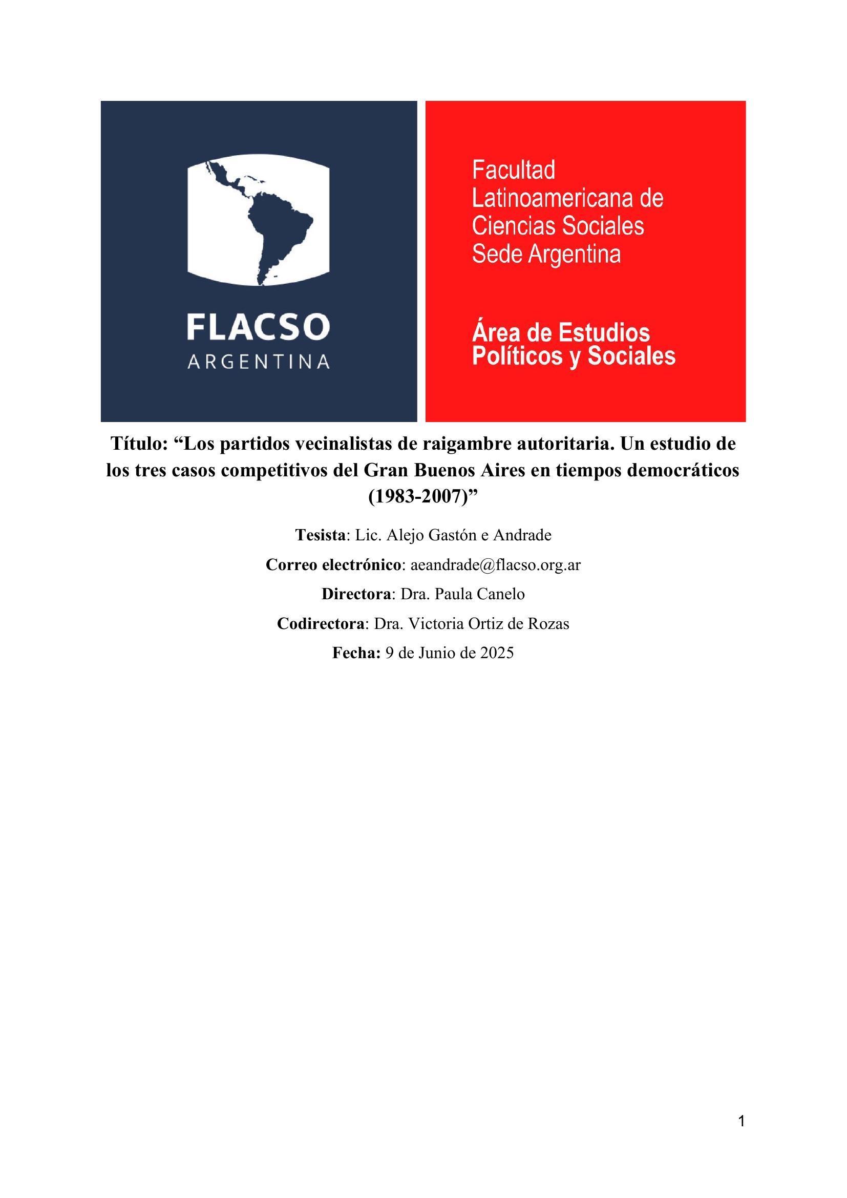 En el Gran Buenos Aires, tres de los nueve líderes y fundadores de los partidos vecinales que lograron acceder a la intendencia en democracia fueron comisionados civiles durante la última dictadura militar, a saber: Alberto Groppi de Esteban Echeverría (1995-2007), Julio Asseff de Moreno (1991-1995) y Ricardo Ubieto de Tigre (1987-2007). La decisión de fundar un partido vecinal, en estos tres casos, se vinculó no solamente con una decisión táctica para competir en elecciones en el nuevo escenario, sino también en la herencia que el autodenominado “Proceso de Reorganización Nacional” les legó. Por ello, este trabajo se propone describir y analizar el surgimiento y el desarrollo de los partidos vecinalistas de raigambre autoritaria del Gran Buenos Aires a partir de la comprensión del rol que cumplieron en la carrera política de sus líderes y fundadores. A través de un estudio comparativo, pone el foco sobre sus pasos iniciales por considerarlos ejemplo de los pocos casos en los que el Plan Político de la dictadura tuvo éxito en su objetivo de forjar una nueva clase política, sobre las maneras en las que llevaron adelante su reconversión en la transición democrática, sobre las razones que los motivaron a crear el partido y sobre sus estrategias y resultados electorales cada vez que decidieron competir. De esta manera, esta tesis constituye un aporte al conocimiento del sistema de partidos bonaerense, en especial el del GBA, al abordar una de las estrategias partidarias anómalas en esta región de la Argentina durante un período en el que alternaron fuerzas políticas provinciales y nacionales de distinto signo político.