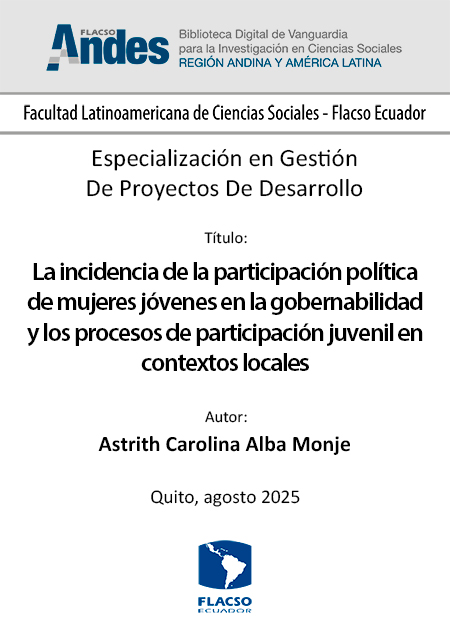 Este trabajo de investigación titulado "La incidencia de la participación política de mujeres jóvenes en la gobernabilidad y los procesos de participación juvenil en contextos locales" tiene como objetivo analizar la participación política e incidencia de las mujeres jóvenes en los Consejos Municipales de Juventud (CMJ) de El Doncello y Florencia, y su relación con la gobernabilidad y la participación juvenil en el departamento del Caquetá, Colombia. La investigación se centra en responder la siguiente pregunta: ¿Cómo inciden y participan las mujeres jóvenes en los CMJ de Florencia y El Doncello, y cómo impacta esto en la gobernabilidad local?