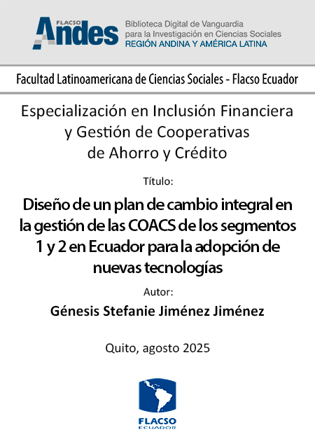 El presente estudio desarrolla un plan de gestión del cambio orientado a facilitar la adopción de nuevas tecnologías en las Cooperativas de Ahorro y Crédito (COACs) de Ecuador, especialmente en los segmentos 1 y 2. El objetivo general es diseñar estrategias que permitan a estas instituciones integrar innovaciones tecnológicas de manera eficiente, minimizando los impactos negativos y maximizando los beneficios tanto operativos como financieros.