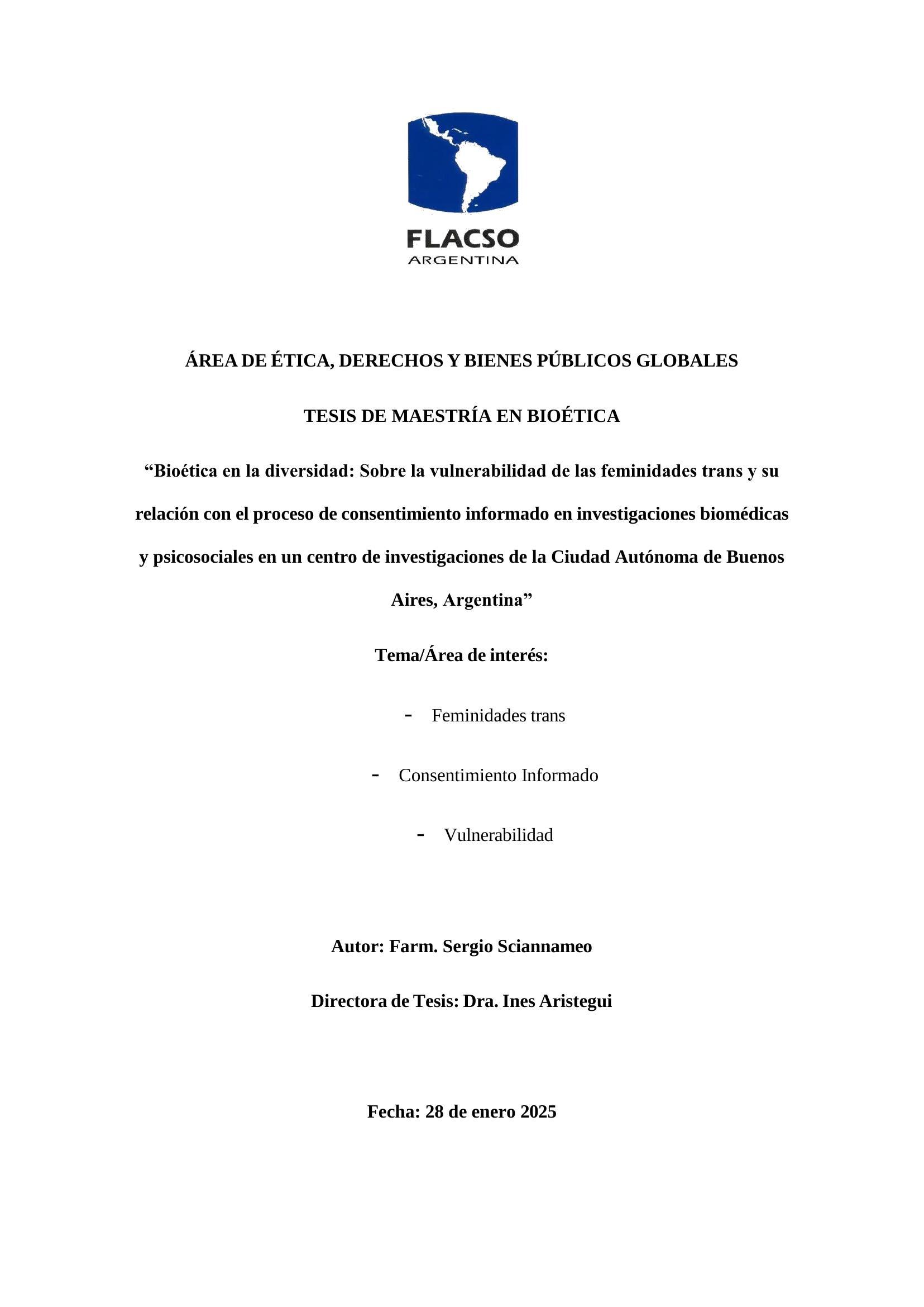 La tesis explora cómo la vulnerabilidad de las feminidades trans (FT) afecta su comprensión del proceso de consentimiento informado (PCI) y de esta manera no asimilan puntos clave sobre su participación en protocolos de investigación clínica y social, planteando la necesidad de implementar medidas de protección adicionales durante el PCI para favorecer el entendimiento sobre los procedimientos de un estudio sea biomédico o psicosocial, resguardando su bienestar y evitando potenciales daños. El objetivo principal es proponer estrategias que aseguren la protección de este colectivo a través de un análisis de las experiencias de investigadores/as, equipo del centro de investigaciones y las participantes en un centro de investigaciones en la Ciudad Autónoma de Buenos Aires. A través de un enfoque cualitativo, se identificaron prácticas que podrían vulnerar derechos, así como necesidades insatisfechas.