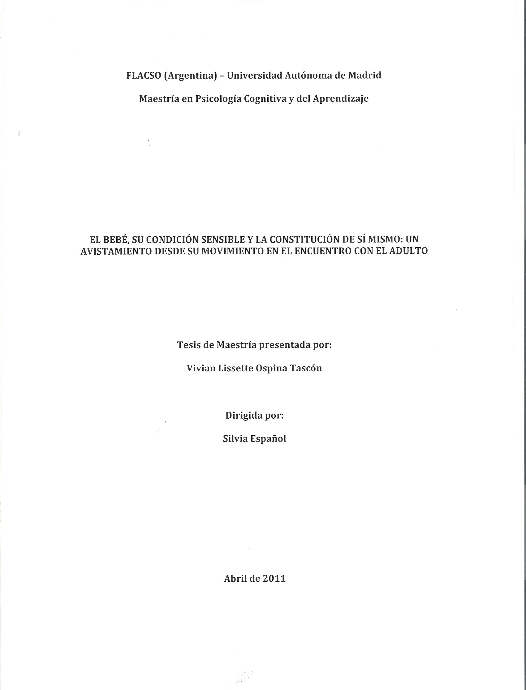 El presente estudio concibe como indisociable la díada adulto - bebé, enfocando su mirada hacia las construcciones corporales con las cuales el bebé se vincula en las interacciones con los adultos a partir de las estimulaciones que éstos le ofrecen. Se busca analizar el despliegue y organización del movimiento del bebé, y en general la organización de su corporalidad,en situaciones de encuentro con los adultos, con miras a explorar todo lo que este nuevo camino de análisis puede permitir ahondar sobre las construcciones psicológicas que el bebé puede realizar sobre sí mismo de manera temprana, tratando de discernir el lugar que tiene su apertura sensible frente a estas construcciones. La perspectiva psicológica dentro de la cual se enmarca el presente estudio es la ciencia cognitiva de segunda generación que da preponderancia al papel del cuerpo y a los procesos de percepción / acción en la construcción del conocimiento.