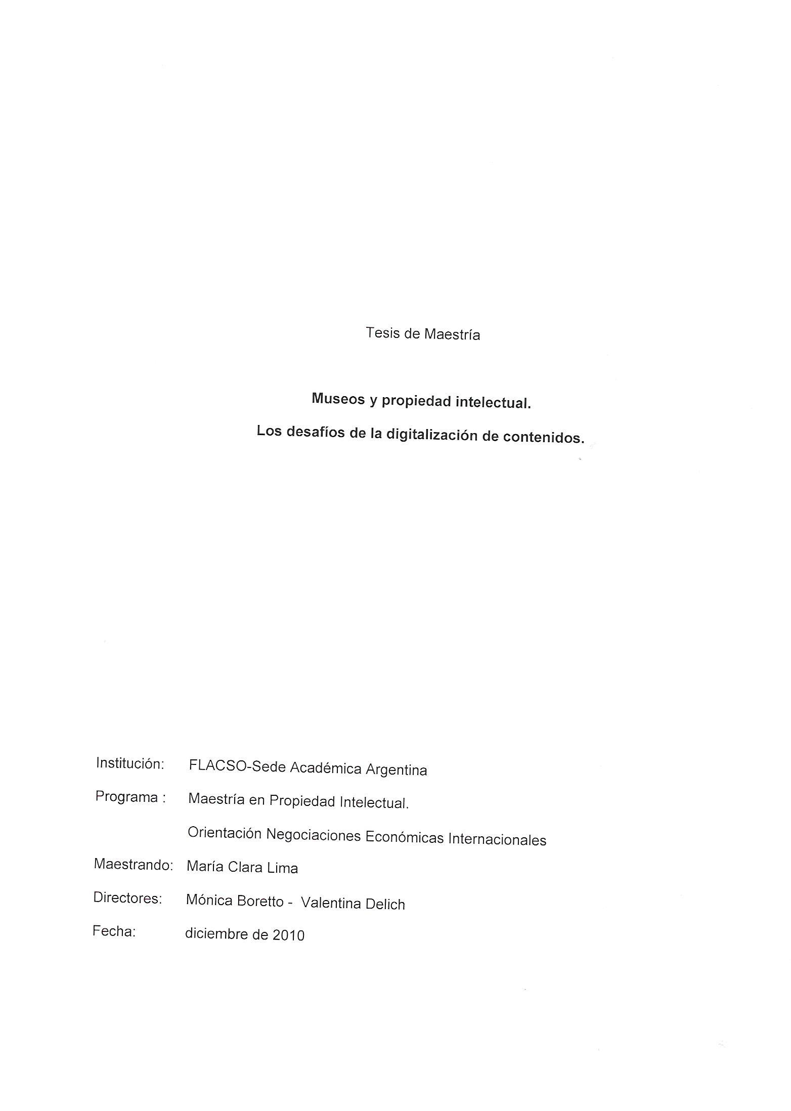 El objetivo general de la tesis es explorar los desafíos que surgen en relación a los derechos de autor y los derechos culturales en las políticas y gestión de la propiedad intelectual en los museos y archivos de Argentina, en particular, lo relativo a la digitalización de contenidos. En el recorrido hacia el objetivo general, se relevarán las políticas o lineamientos generales sobre la materia en museos y archivos seleccionados y se discutirá la relevancia de la existencia de una excepción para las actividades de instituciones culturales (como ser museos archivos y bibliotecas) que eviten conflictos judiciales por infracción de derechos de autor. En efecto, esta tesis se ocupa de analizar la necesidad y conveniencia de la digitalización de los contenidos de los museos y archivos a la luz de las normas en la Argentina, en particular, aquellas normas que regulan directamente los derechos de autor. En una segunda instancia, esta tesis propone una línea de acción que tienda a resolver la tensión entre las ventajas de la digitalización en términos de conservación y difusión y las disposiciones normativas relativas a los derechos de autor.