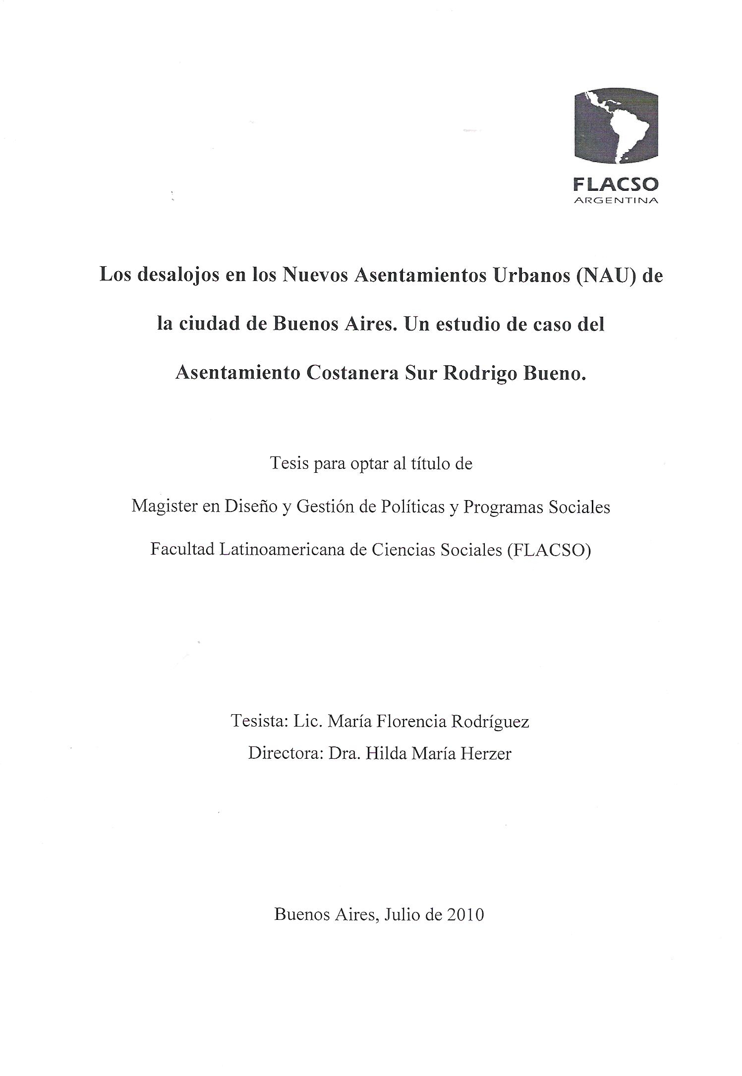 proceso de desalojo que el Gobierno de la Ciudad (GCBA) impulsó hacia el NAU Costanera Sur Rodrigo Bueno. Los Nuevos Asentamientos Urbanos constituyen una modalidad de hábitat popular que adquiere fuerza a partir de la crisis de 2001, sin embargo no son reconocidos por el GCBA para la implementación de políticas de urbanización. Priman acciones de expulsión hacia los NAUs, centralmente, si se trata de predios pasibles de revalorización para el mercado inmobiliario. Este es el caso del asentamiento Costanera Sur Rodrigo Bueno cuya ubicación próxima a Puerto Madero lo convirtió en un lugar preciado para el desarrollo de grandes emprendimientos urbanos. Bajo el argumento de que es imposible la urbanización, el GCBA efectuó un desalojo otorgando a estos habitantes un subsidio habitacional. No obstante, detrás de este modo de intervención subyacen otros intereses en el que participan diversos actores por la apropiación y uso legítimo de este lugar. De esta manera este trabajo intenta abordar el proceso de desalojo que el GCBA implementó hacia el NAU Rodrigo Bueno tomando en cuenta las relaciones que los diversos actores intervinientes establecen en torno a ese espacio, a través de la realización de entrevistas en profundidad.