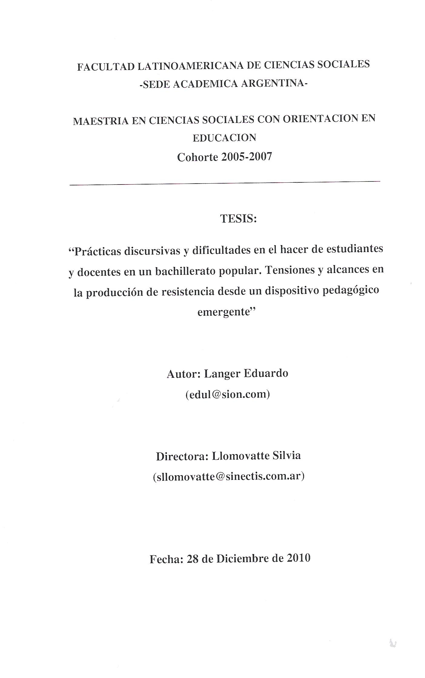 educativas que se estructuran contra el sistema neoliberal de producción de marginación y en el escenario argentino post 2001 de desocupación y pobreza. Adoptando el enfoque de la gubernamentalidad, analizaremos cómo las producciones de los dispositivos pedagógicos emergentes a través de determinadas experiencias educativas cotidianas y reales, los bachilleratos populares, dan algunas respuestas a las realidades educativas fragmentadas. Caracterizaremos los bachilleratos populares desde las propias prácticas discursivas de los sujetos como escuelas públicas estatales pero con control social y que tienden a la autogestión escolar ejercida por la sociedad civil organizada, como un tipo de enseñanza sistemática, democrática, gratuita, universal y donde los sujetos elaboran y