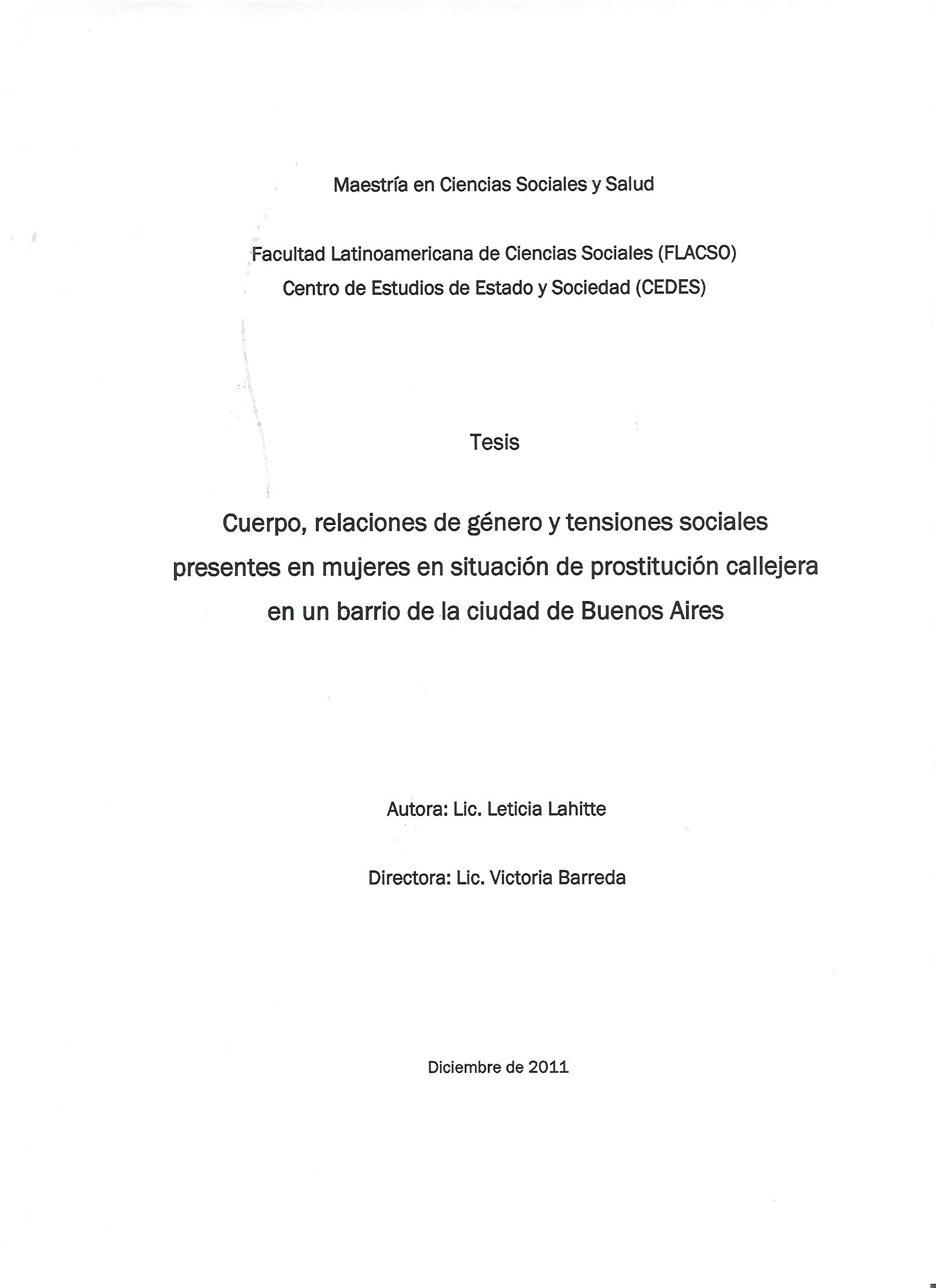 En esta tesis se articulan dos momentos de una investigación con un mismo universo de análisis: mujeres en situación de prostitución callejera ubicadas en la Plaza Pueyrredón (conocida como Plaza Flores) y en zonas aledañas del barrio de Flores de la Ciudad Autónoma de Buenos Aires. A partir de la utilización de un enfoque etnográfico se enmarca la problemática en términos de situación de prostitución, articulando la misma dentro de las lógicas de la economía política de la calle, y como parte del mercado sexual de la/s industria/s del sexo. Desde una perspectiva de género y desde diferentes enfoques teóricos con relación al cuerpo, se centra el análisis en su construcción, considerando las relaciones genéricas y sociales presentes en la misma. Partiendo que el cuerpo es tanto fuente de metáforas como de emociones, conocimiento y resistencia, se exploran tanto las asociaciones corporales como sus formas de resistencias. Asimismo, se describen y analizan los efectos de poder, regulación, experiencia y padecimientos de las mujeres en situación de prostitución callejera, atendiendo a las persistencias y cambios en relación a los dos momentos de investigación.