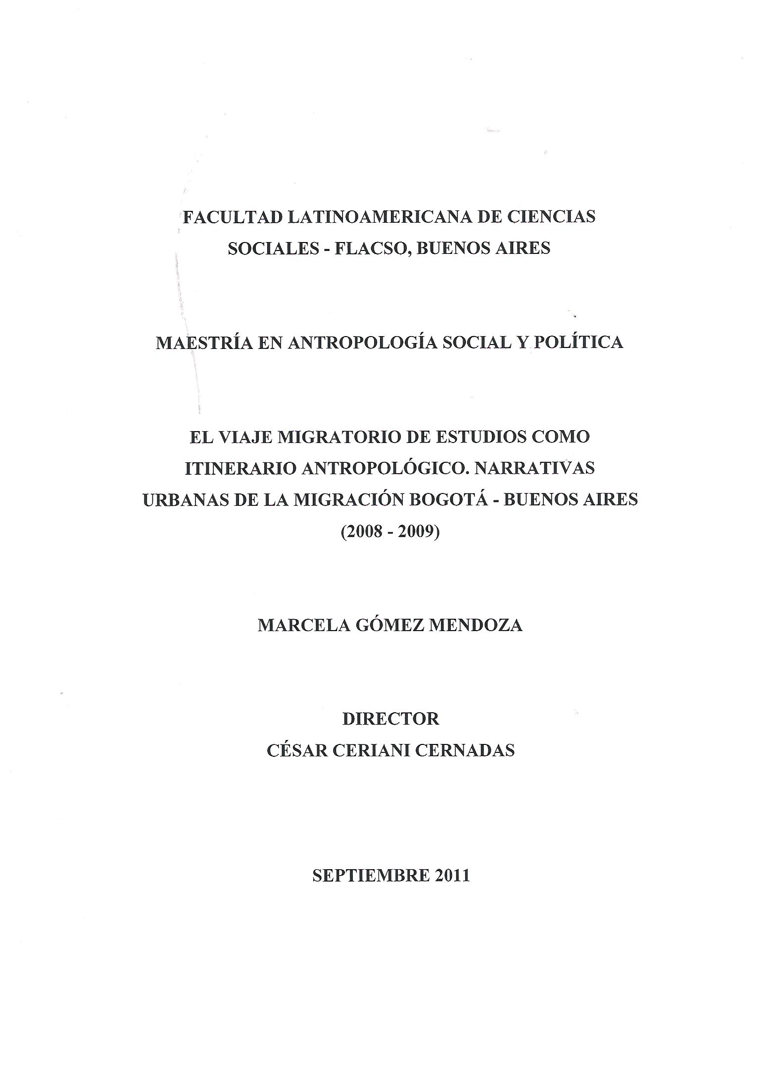 framework presents a parallel between the fieldwork as central practice in the construction of disciplinary knowledge and migration as an empirical experience that produces knowledge as well, constructing a comparative perspective to analyze the sociocultural processes occurring between these two cities. From the methodological point of view, and taking into consideration the subjectivities of these social actors, the thesis is organized as an itinerary marked by three different moments: before traveling, the arrival, and a year after arriving evidencing the way knowledge responds to issues such as distance and social and local localizations.