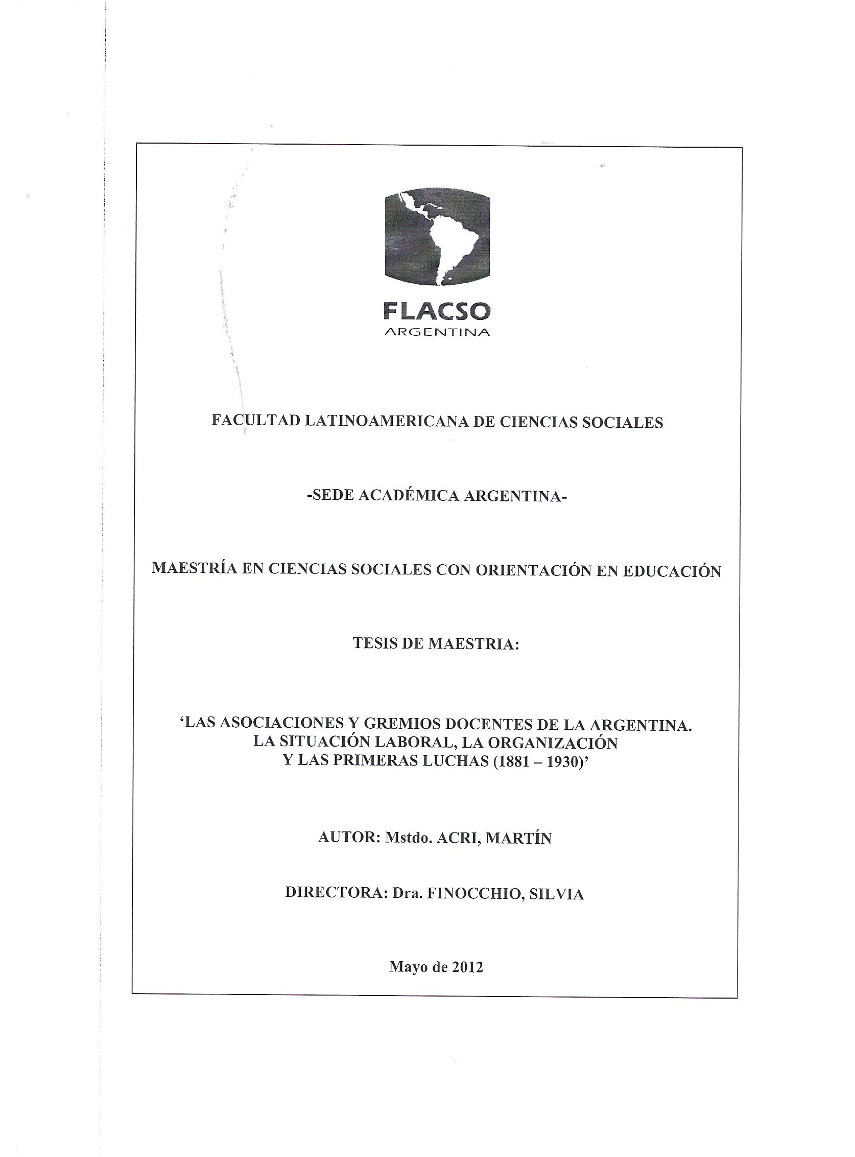 Las asociaciones y gremios docentes de la Argentina : la situación laboral, la organización y las primeras luchas, 1881 - 1930.