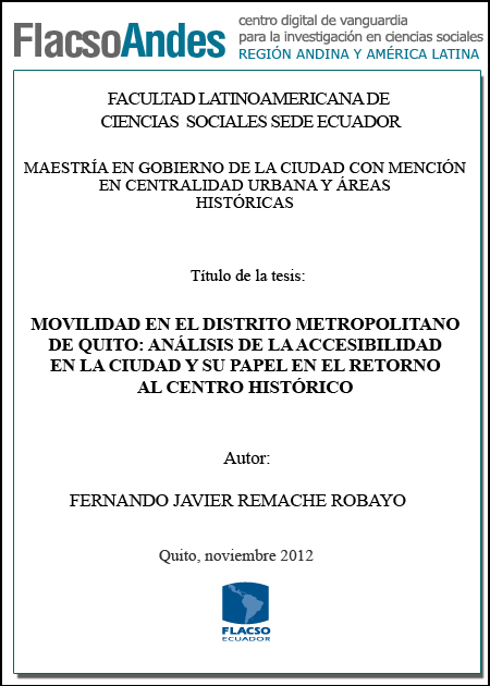 El centro histórico de Quito constituye el principal elemento simbólico de la ciudad, lugar por el cual comenzó a forjarse la configuración territorial y social de la española ciudad de San Francisco de Quito; escenario diario de la más diversas y complejas relaciones urbanas que han permitido forjar la identidad ciudadana de esta urbe. Por esta misma razón los conflictos y tensiones sociales tampoco han sido ajenos a la vivencia diaria de los usuarios de este sector, ya sea por mal uso del espacio público o por falta del mismo, la fragilidad de este sector se manifiesta constantemente por su condición de histórico patrimonial. Uno de los principales desafíos que enfrenta el centro histórico es el de recuperar integralmente el espacio público para que este sea capaz de receptar una accesibilidad equitativa del conglomerado urbano. Por otro lado, la movilidad vigente en la ciudad, tiene como protagonista principal al vehículo privado relegando medios de transportación colectivos y alternativos a un segundo plano, pues la urbe ha sido estructurada para facilitar los traslados motorizados individualistas. Es aquí donde iniciamos este estudio, pues no podemos hablar de un retorno al centro histórico de Quito si todavía los servicios e infraestructuras urbanas aquí presentes continúan favoreciendo y estimulando el uso del vehículo particular pese a que este representa el mayor peligro para la conservación de los inmuebles históricos.