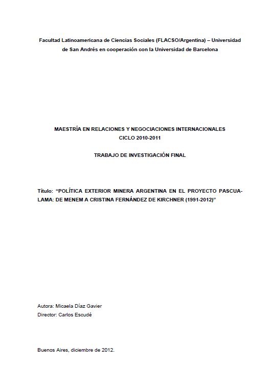 La presente tesis realiza un estudio de la política exterior argentina en materia minera desde principios de los años ´90 (es decir, desde la implementación de un modelo neoliberal a ultranzas) hasta el actual modelo post crisis del año 2001, con especial enfoque en el Proyecto Pascua - Lama. Se intentan dilucidar las variables cuya interacción explicará la actual coyuntura argentina en esta materia.