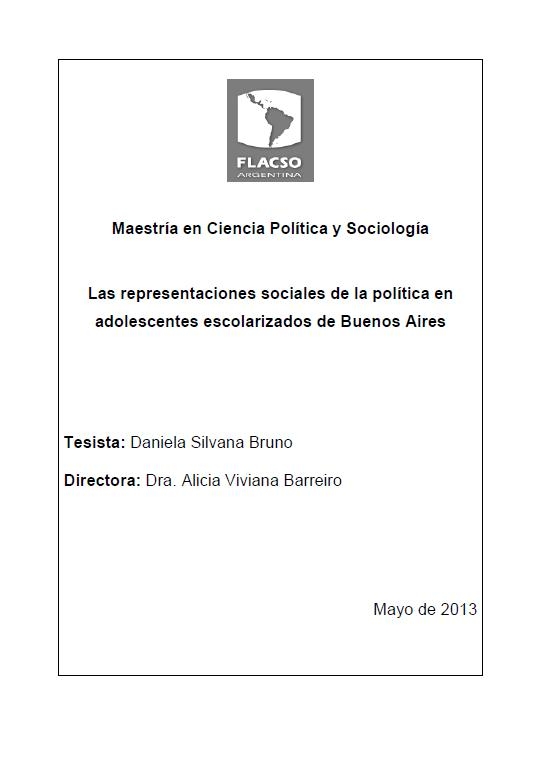 política. El objetivo de este trabajo fue indagar la representación social de la política de adolescentes escolarizados de Buenos Aires y sus posicionamientos diferenciales según su pertenencia a distintos grupos sociales. Se utilizó una muestra intencional compuesta por 203 estudiantes, con edades entre 17 y 18 años. Se administró la técnica de asociación de