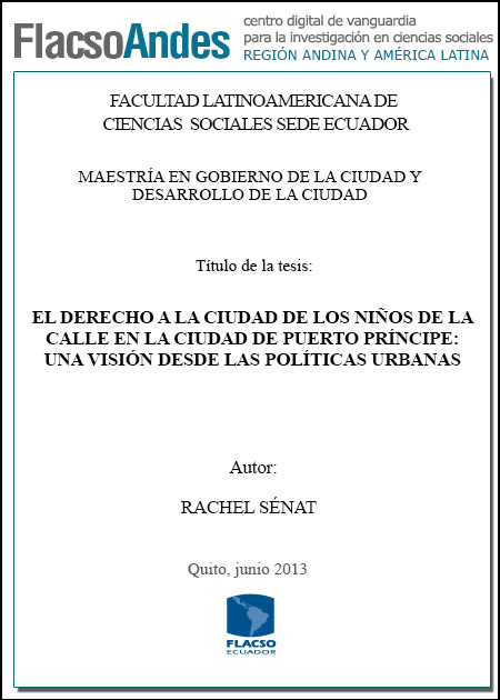 Esta tesis trata de la problemática de niños de la calle como fenómeno social que ocurre en el espacio urbano. Es una investigación cualitativa que pone énfasis en las fallas que abarcan los debates acerca de la reconstrucción de la ciudad de Puerto Príncipe tras el terremoto que sucedió el día martes 12 de enero de 2010. Se pretende mostrar los obstáculos, tanto internos como externos que estorban las posibilidades para integrar la problemática de los niños de la calle en la agenda de las políticas urbanas. Con respecto a ese contexto particular de la reconstrucción de la ciudad, se analizan cuáles son los intereses en juego en este proceso, considerando el peso de la comunidad internacional frente a la capacidad de negociar de los actores locales. Por ese camino, se busca mostrar la violación de los derechos de los niños de la calle de la ciudad de Puerto Príncipe como seres humanos, niños y ciudadanos. Así el derecho a la ciudad de los niños de la calle