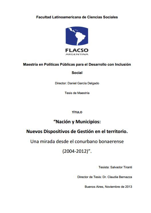 En este marco general, la pregunta de investigación que subyace este trabajo es: ¿cómo funcionan estos Nuevos Dispositivos de Gestión que emergieron de la implementación en el territorio de los programas nacionales? ¿Cómo impactaron en los Municipios y en el modo de articulación con Estado Nacional? En este contexto, nuestro objetivo general es describir y analizar los NDG que emergieron de la implementación en el territorio de los programas nacionales seleccionados. En segundo lugar, nos proponemos analizar y describir el impacto que tuvieron sobre los municipios en el conurbano bonaerense y en su relación con el Estado nacional. A partir de una estrategia de investigación cualitativa, basada en el análisis de la formulación del Programa Agua + Trabajo dependiente del Ministerio de Planificación Federal, Inversión pública y Servicios; el Programa Jóvenes con Más y Mejor Trabajo cuyo responsable es el Ministerio de Trabajo, Empleo y Seguridad Social; y el Programa Ingreso Social con Trabajo “Argentina Trabaja” que ejecuta el Ministerio de Desarrollo Social de la Nación, construimos las principales características del NDG con el objetivo de describirlo y analizarlo. Nuestro trabajo comprendió el desarrollo de los programas mencionados en el primer cordón del conurbano bonaerense (haciendo foco en su formulación) durante el período comprendido entre los años 2004-2012.