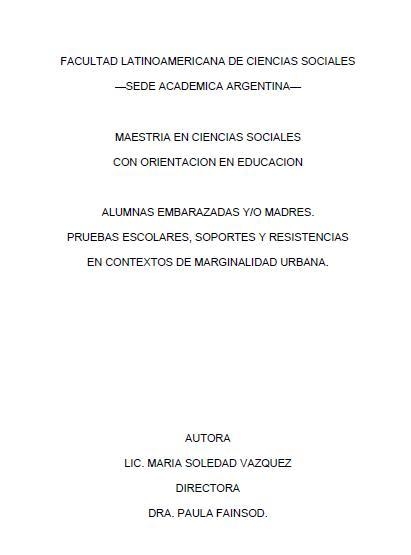 padres, madres y gestantes; una propuesta escolar específica; y el trabajo desarrollado por otras mujeres de sus familias. A la vez, en línea con Calveiro, esas escolaridades se configuran como prácticas de resistencia a la imposición del trabajo doméstico que sufren en sus hogares. Con una intencionalidad teórica y política, esta tesis espera contribuir al debate en la materia a fin de tensionar las argumentaciones estigmatizantes, al tiempo que constituirse como una herramienta útil para el desarrollo de políticas públicas destinadas a los y las adolescentes padres, madres y/o embarazadas. This thesis addresses the connection pregnancy and/or maternity - schooling. It is proposed as a space from which to discuss theoretically and empirically that adolescent maternity inevitably leads to dropout. In it come together contributions from contemporary critical education sociology; critical