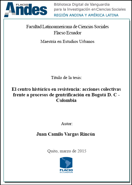 La presente investigación se interesa en analizar el proceso de gentrificación en dos barrios pertenecientes al Centro Histórico de Bogotá-, teniendo en cuenta los cambios de usos sociales del suelo generados por las políticas urbanas de la ciudad. Frente a esto, resistencias vecinales por medio de acciones colectivas que manifiestan su oposición a los proyectos implicados, proponiendo incidencia ciudadana en la gestión territorial. Como eje delimitador se propone abordar el tema habitacional, atendiendo su vinculación directa con los impactos sociales hacia la población residente, a saber, el desplazamiento paulatino de los habitantes tradicionales y la llegada de nuevos moradores y sectores socio-económicos, pertenecientes a capas medias y altas de la sociedad, ocasionando dinámicas gentrificadoras. Se trata de entender los distintos mecanismos que están ocasionando desplazamiento y exclusión de barrios históricos, y de cómo reaccionan los actores vecinales para garantizar su permanencia y derecho a la ciudad, en este caso, a partir de un marco contra-gentrificador que invita a pensar en nuevos patrones de integración socio-económica en los centros históricos de las ciudades latinoamericanas, el caso La Candelaria pretende ser un aporte para ello.