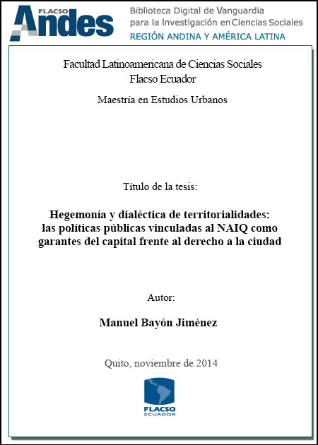 El Nuevo Aeropuerto Internacional de Quito (NAIQ) es el proyecto urbanístico que ha comportado una mayor transformación territorial de la ciudad de Quito en los últimos años. Aunque su planificación comienza en los años 70 del S.XX, su ejecución se llevó a cabo de 2005 a 2013, comenzando a operar en febrero de 2013. Se trata de uno de los proyectos con mayor actualidad informativa y con asignación presupuestaria1, que ha motivado un fuerte debate político entre los partidos políticos que integraron el Concejo Metropolitano de Quito. En el periodo de construcción del NAIQ se produce en Ecuador un cambio institucional muy profundo, a partir de la promulgación en 2008 de la nueva Constitución de Montecristi, bajo el impulso del cambio político protagonizado por el movimiento Alianza País y el Presidente de la República Rafael Correa, que recoge el acumulado político de dos décadas de fuertes protestas sociales y propuestas de cambio en el país.