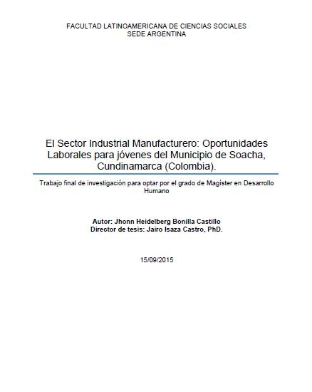 Este documento presenta los resultados de una investigación cuyo propósito fue caracterizar categorías ocupacionales requeridas por empresas del sector manufacturero del municipio de Soacha (Colombia), con potencial de contratar jóvenes. Para ello se realizó una consulta a 38 empresas del municipio sobre sus ocupaciones de alta rotación y las variables que inciden en las decisiones de vinculación laboral de jóvenes. A su vez, se realizó una consulta a 395 jóvenes para conocer cómo estos entienden el mercado laboral; y se recopiló información sobre las instituciones que en Soacha brindan formación asociada con el sector. El estudio concluye que existen oportunidades de vinculación laboral para jóvenes en situación de vulnerabilidad y pobreza en el territorio, aunque tengan barreras de acceso a la cualificación. Sin embargo, los jóvenes que están logrando cualificarse le plantean retos directos a todos los actores del desarrollo de Soacha, pues sus competencias pueden llegar a superar las expectativas de la demanda laboral general del municipio, por lo cual es necesario planear cómo aprovechar este Bono demográfico, objetivo para el cual se brindan algunos lineamientos y se sugiere poner en marcha una alianza local por el empleo. This document presents the results of a research whose main objective was to characterize occupational categories required by manufacturing enterprises of the municipality of Soacha (Colombia) with the potential of hiring young workers. For this purpose, 38 enterprises were consulted in order to know about high turnover positions and the variables that determine the decisions to hire young workers. At the same time, the study surveyed 395 youngsters in order to know how they understand the local labour market. Finally, the study looks at the institutions that provide training for this population. As a main finding, the study concludes that there are employment opportunities for the young population of this municipality although; access to training is a major obstacle. This population is getting training and qualifications and represents some challenges for local authorities in Soacha as their competences might not be fully demanded in the local labour market. Overall, this entails a major challenge in order to fully take advantage of the demographic bonus that this population is going through. Some guidelines are provided at the end of this document towards an employment local alliance.