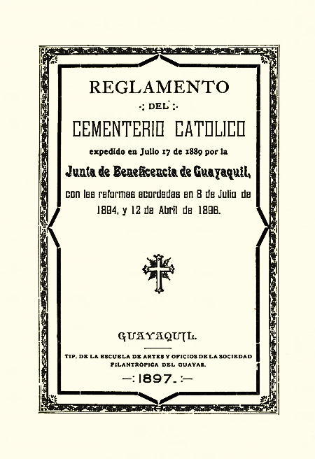 La Junta de Beneficiencia de Guayaquil en el uso de las atribuciones que le conceen el inciso 3º del art. 13º de su Reglamento y el Decreto Legislativo de 2 de Agosto de 1890 ha expedido para el Cementerio Católico de esta ciudad el siguiente reglamento.