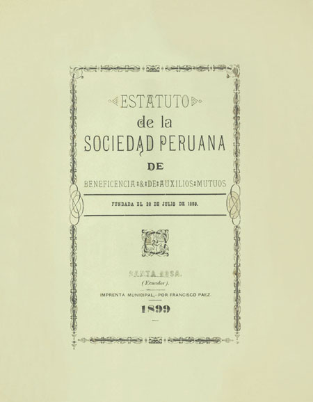 La Sociedad Peruana de Beneficencia y de Auxilios Mutuos, fundada el 28 de Julio de 1893 en el Cantón Santa Rosa -Provincia de “El Oro”- República del Ecuador, es la reunión de ciudadanos peruanos, residentes en dicha Provincia, inscritos en su “Registro General de Inscripciones de Socios”, de conformidad con éste Estatuto.