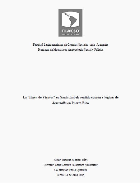 La siguiente tesis explora cómo la construcción del primer parque eólico en Puerto Rico, la “Finca de Vientos” en Santa Isabel, estuvo intervenida por lógicas de desarrollo ancladas a nociones de dependencia y progreso configuradas a partir de 1898 en la isla. El acontecimiento conocido popularmente como “la llegada de los americanos ”en ese año, se ha interpretado históricamente en términos coloniales como un “cambio de soberanía”. A partir de esa estructura de coyuntura, se naturalizó el estado de “atraso” que habían heredado los puertorriqueños de España, justificándose así el proyecto civilizatorio de los Estados Unidos sobre la isla. En 1952 éste proyecto “culminó” con el establecimiento del Estado Libre Asociado de Puerto Rico como “innovación” constitucional autonómica y como resultado del “modelo de desarrollo”. En el marco de los estudios antropológicos del desarrollo, el siguiente escrito propone establecer un nexo entre el desarrollo, en tanto idea/fuerza ligada a los meta-relatos constitutivos de la Modernidad, y el sentido común como sistema cultural. Consecuentemente, los aerogeneradores instalados sobre los terrenos más fértiles de Puerto Rico no solo representan una contradicción en términos geográficos-espaciales, sino que son producto de la relación colonial consensuada que reproduce un capitalismo de la misma naturaleza. The following thesis explores how the construction of the first wind farm in Puerto Rico, “Finca de Vientos” in Santa Isabel, was operated by logics of development that are anchored to notions of dependence and progress that have been set since 1898 on the island. The event commonly known as "the arrival of the Americans" in that year, has been historically interpreted, in colonial terms, as a "change of sovereignty". From that structure of juncture, the state of "backwardness" that Puerto Ricans had inherited from Spain was naturalized, thus justifying the civilizing project of the US in the island. In 1952 this project "ended" with the establishment of the Commonwealth of Puerto Rico as a constitutional autonomic “innovation” and as the result of the "development model". In the context of anthropological studies of development, the following paper proposes to establish a link between development, as an idea / force linked to the meta- narratives constitutive of modernity, and the common sense of Puerto Ricans. In this sense, the wind turbines installed on the most fertile land in Puerto Rico represents not only a geographically contradiction, is part of the dependent development that stimulates the colonial relationship and reproduces a capitalismo the same nature.