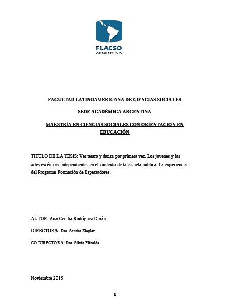 subjetividad escolar hacia la subjetividad del espectador de las artes escénicas en varios aspectos: disciplina, relación con la autoridad y disponibilidad en la atención. Y en relación a la recepción de las artes escénicas como “nuevo espectador”, los jóvenes tienden a ver las obras con prejuicios en relación a que todo lo que viene de la escuela es de “mala” calidad, aburrido y con la expectativa de que tenga lenguaje aniñado o infantil; con la necesidad de ser hiper estimulados para no caer en la sensación de estar “perdiendo” el tiempo; con dificultad y extrañeza de tener que expresar sus emociones; haciendo foco más en temas técnicos que en cuestiones argumentales y emocionales; y juzgando moralmente a los personajes muchas veces como sujetos reprochables por su condición social o sus opciones sexuales. El estudio también devela los procesos que los jóvenes realizan en las sucesivas exposiciones a las obras, así como las diferencias que presentan en virtud de sus instituciones educativas de procedencia. Estos estudios permiten, entonces, una mayor comprensión a la hora de pensar en un acceso posible a las artes de la Ciudad para los jóvenes de las escuelas públicas y brindan indicios al momento de desarrollar estrategias que vinculan los productos artísticos y la educación, atendiendo a la finalidad de introducir a los espectadores nóveles en la experiencia estética que ofrece el mundo de las artes escénicas. This research is aim to build an input to the studies about young people and the reception of the performing arts, inside school context. Taking the program “Formación de Espectadores” (“Forming Spectators”) that belongs to the Ministry of Education, from the Goverment of the City of Buenos Aires, which has being implemented since 2005, this work inquires into the process of the formation of young people attending to the theatre for the first time, as performing arts spectators. Inside this context, this investigation wonders about the space that the emotions occupy, about the ways that the school intitution takes part in it and how those receivers “watch” the performances, i. e., their gaze on the performing arts.