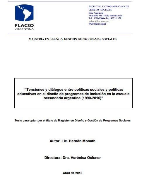 El presente trabajo se postula como tesis de la Maestría en Diseño y Gestión de Programas Sociales en FLACSO -Argentina-. El problema de investigación refiere al diseño programático del Plan Social Educativo (1993), el Programa Nacional de Inclusión Educativa (2003) y la Asignación Universal por Hijo/a (2009) focalizando en los sentidos otorgados por los responsables de dichos programas a las nociones de inclusión social, inclusión educativa y la relación a nivel de diseño programático entre el campo de las políticas educativas y sociales para la inclusión social de los y las jóvenes en situaciones de vulnerabilidad. Se pretende mostrar, desde un enfoque analítico, los modos en que el Estado y sus operadores proyectan sus propias definiciones conceptuales hegemónicas en el diseño de programas de inclusión social, aún con conceptos que perduran en el tiempo y desde distintas orientaciones políticas, manteniendo el uso de términos que por su carácter polisémico justifican intervenciones sociales de características disímiles. En estas proyecciones de