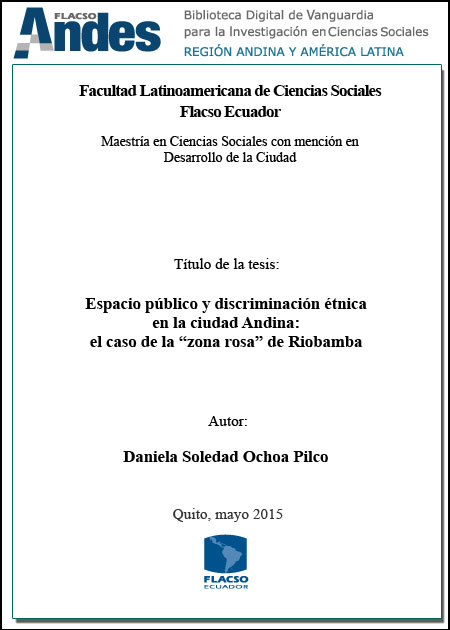 En la siguiente tesis se realiza un abordaje desde los estudios culturales, sobre cómo se construyen las tácticas espaciales de discriminación en el espacio público en Riobamba, a fin de comprender la estructura colonial que se ha ejercido desde la fundación de la ciudad y que se mantiene bajo un nuevo rostro en esta época de globalización. Para lograr determinar este objetivo se elaboró un estudio de caso en la Avenida Daniel León Borja o Zona Rosa –el espacio público más concurrido de la urbe–, donde se muestra la clave de la política urbanística de la modernidad riobambeña que, desde el 2010, se convirtió en el eje más importante de rehabilitación de la imagen urbana.