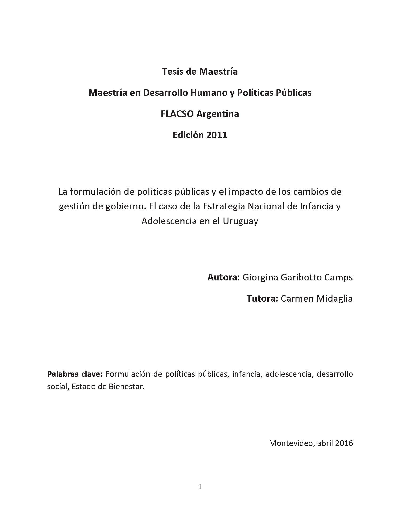 ministerial (Chasquetti; 2004). En otras palabras, la presente tesis se plantea identificar las características más sobresalientes del proceso de diseño de una nueva política pública con la pretensión de analizar las condiciones que favorecen su permanencia en el tiempo. Se busca estudiar el grado de implementación de la ENIA a partir del cambio de gobierno en 2010 que supuso la continuidad del mismo partido político en el gobierno (Frente Amplio, izquierda política pero con rotación de la fracción partidaria triunfadora). Complementariamente, este trabajo intenta detallar los aprendizajes que aporta una experiencia de construcción de políticas públicas en un campo relativamente “virgen” en términos de tradición de la acción del estado uruguayo.